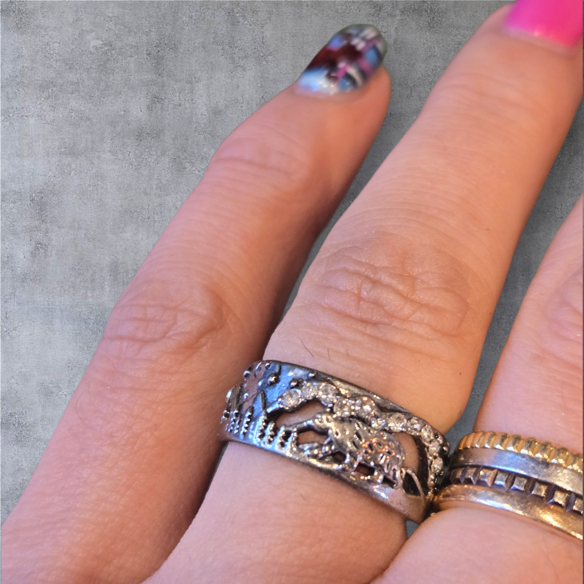 煌めくクリアストーンの背景の周りをアニマルが歩いているデザインリング。