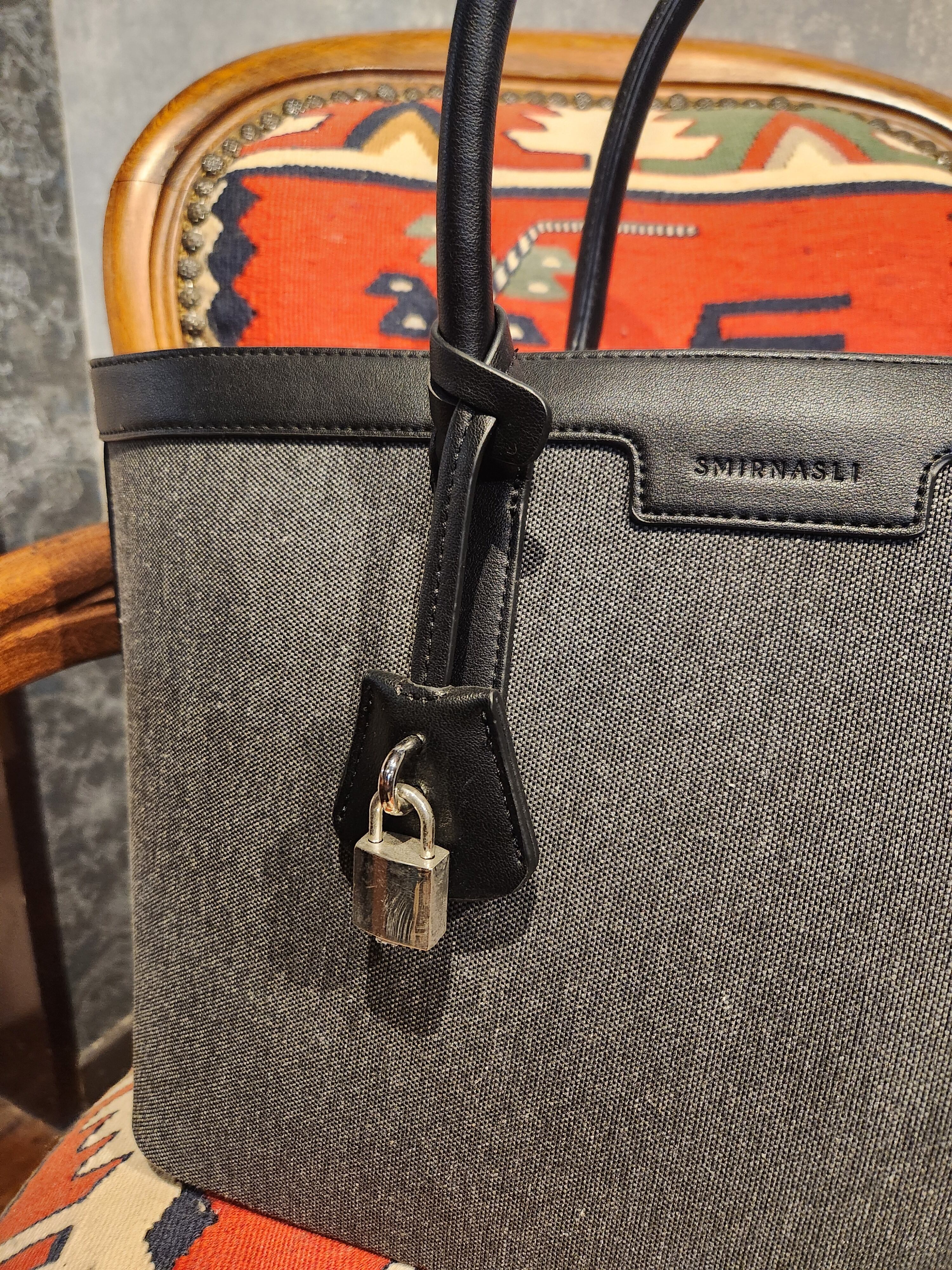 ■素材感:シックなポリエステル素材とフェイクレザーのコンビ