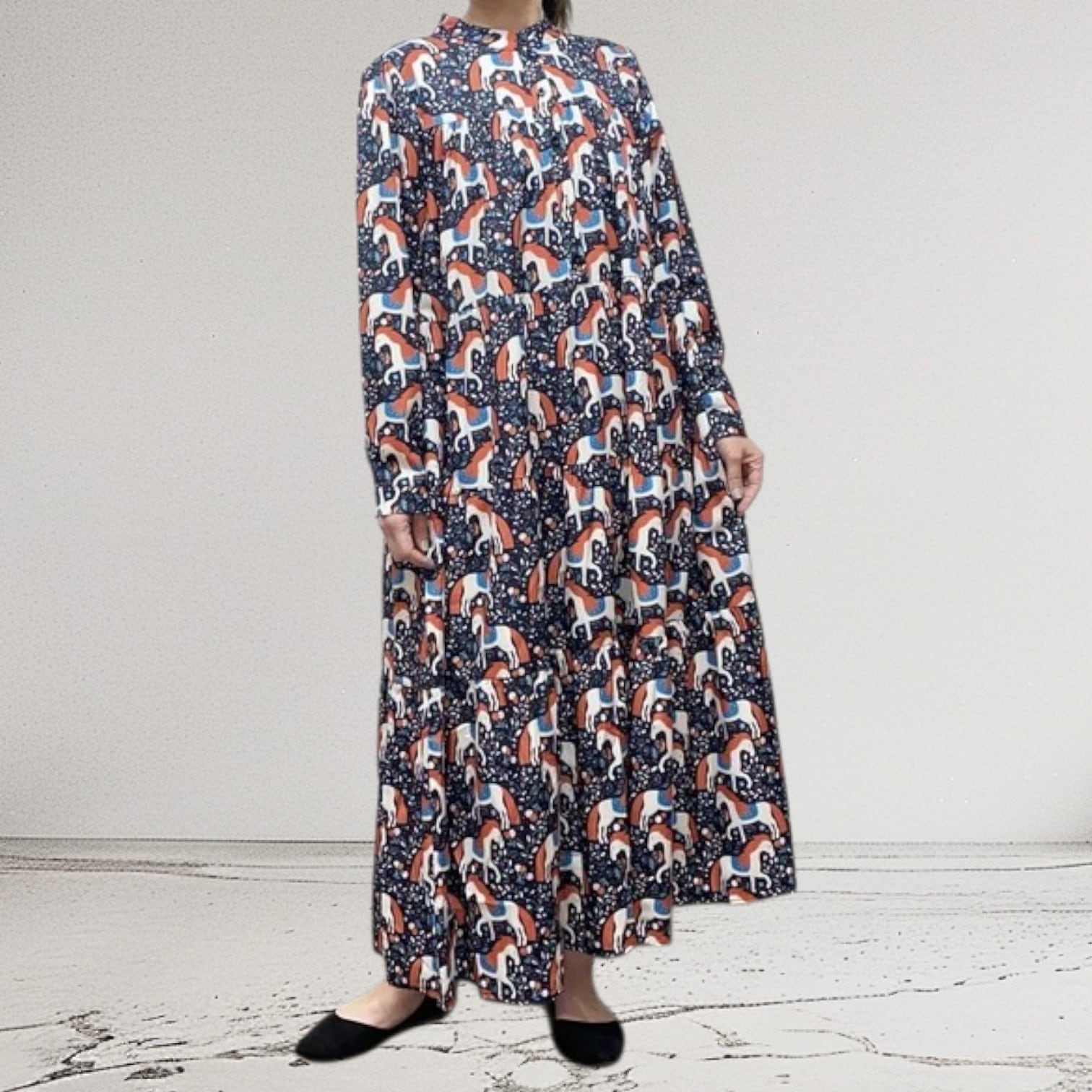 ティアードデザインAラインシルエットのマキシ丈ワンピース