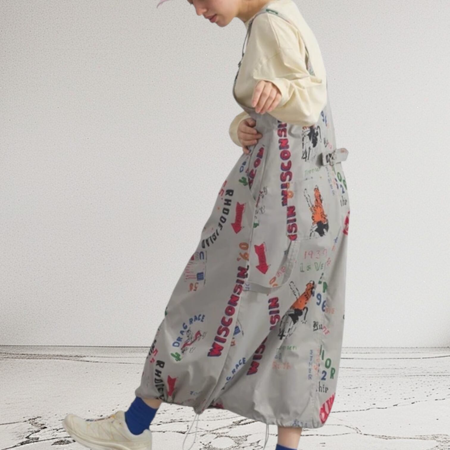 洗練されたワークテイストと愛らしいフォルムが溶け合う、独創的なテクスチャーのバルーンサロペット