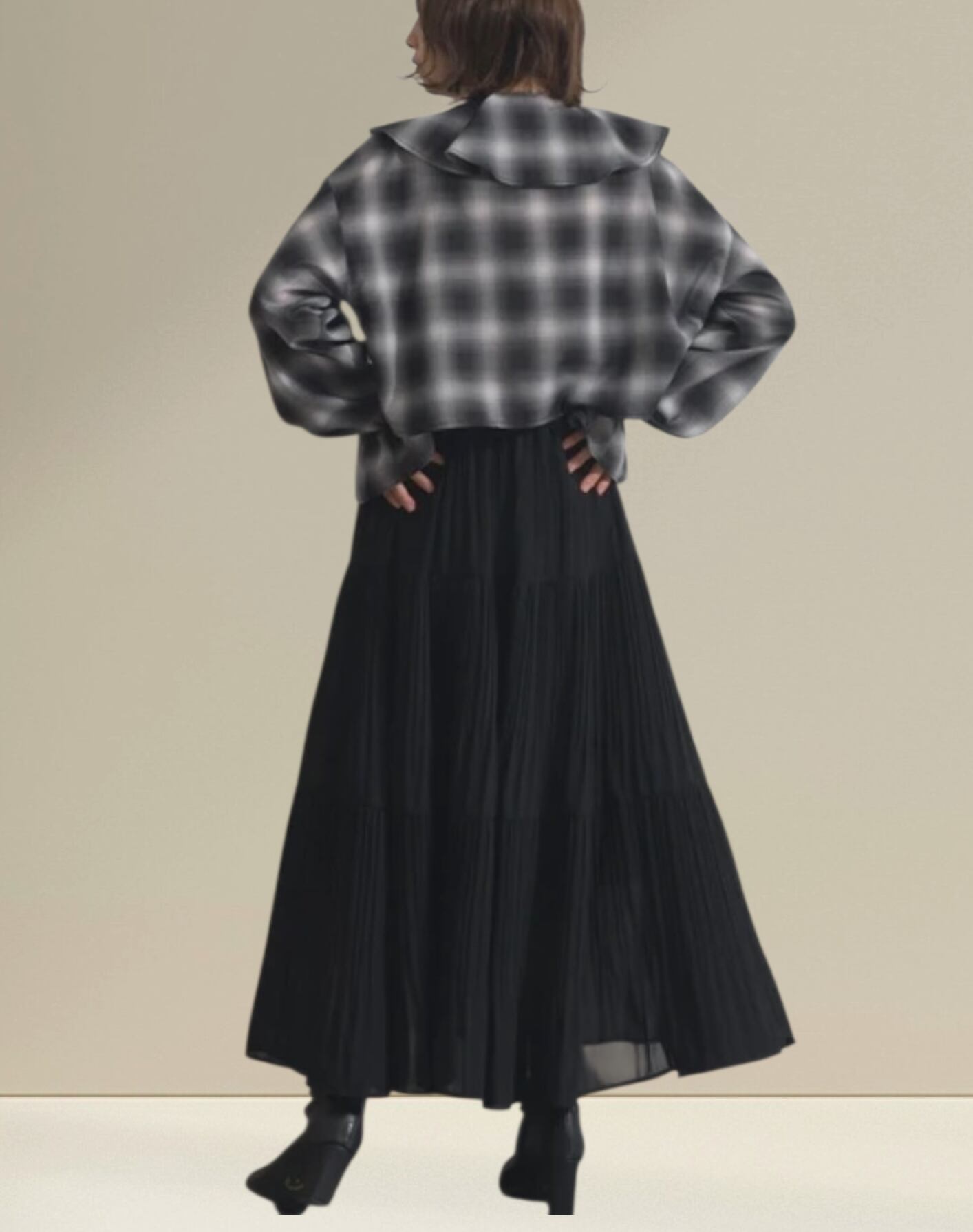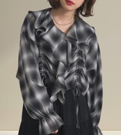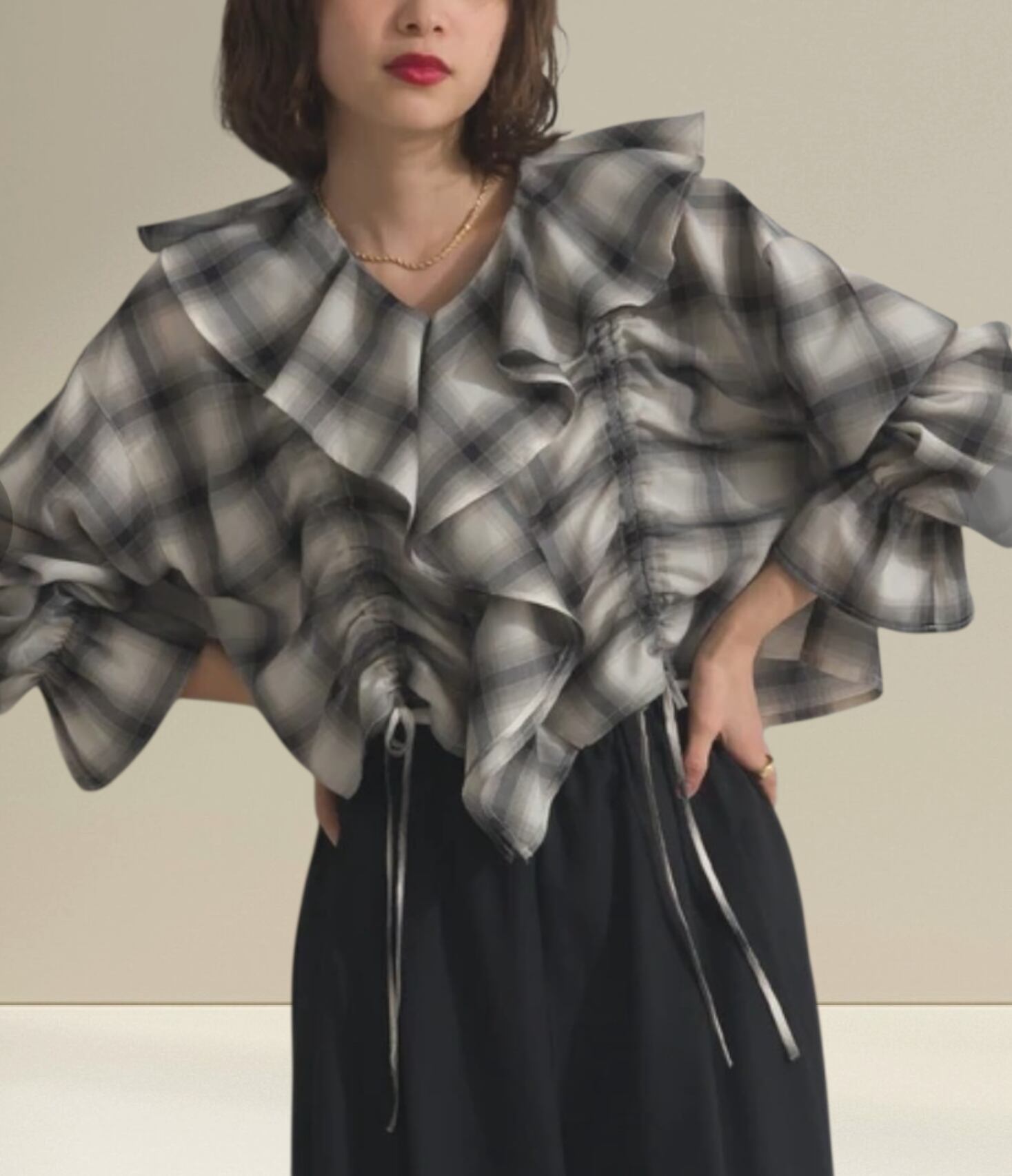 先染めのシアーチェック素材を使用した、フリルデザインのドロストブラウス