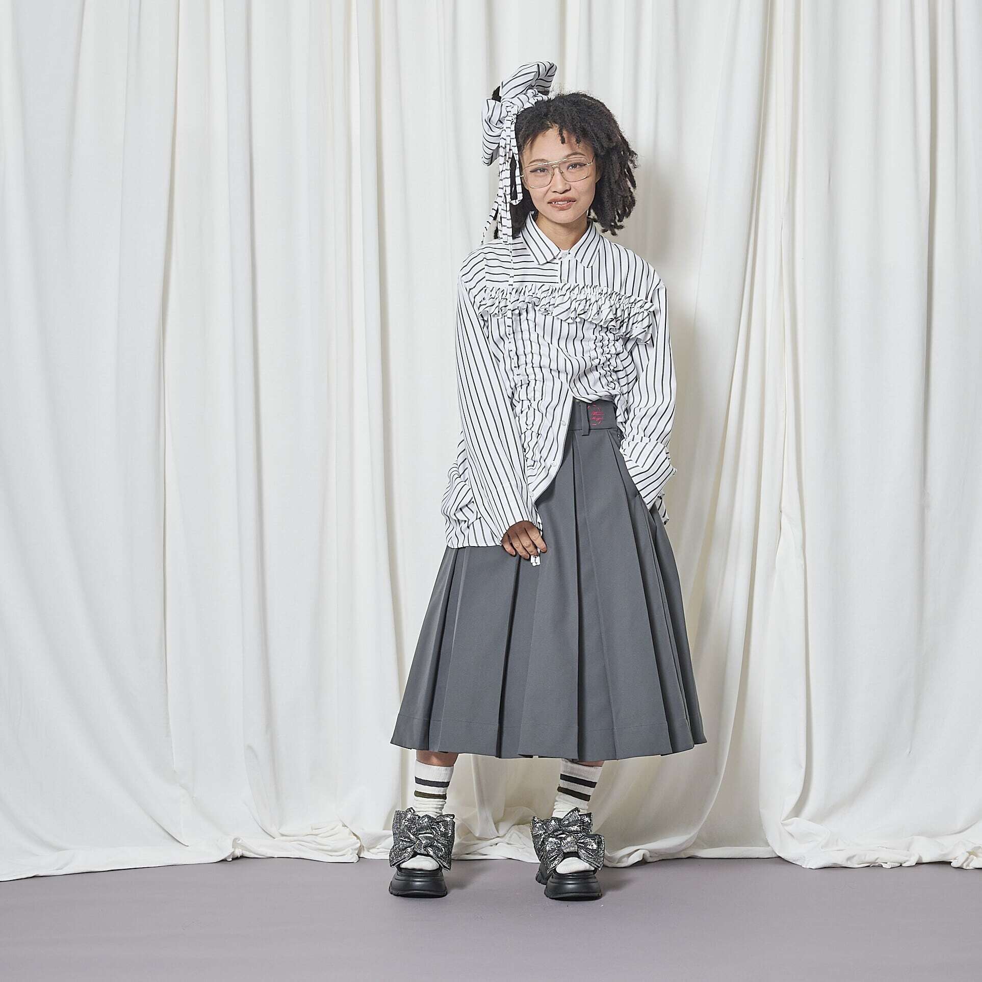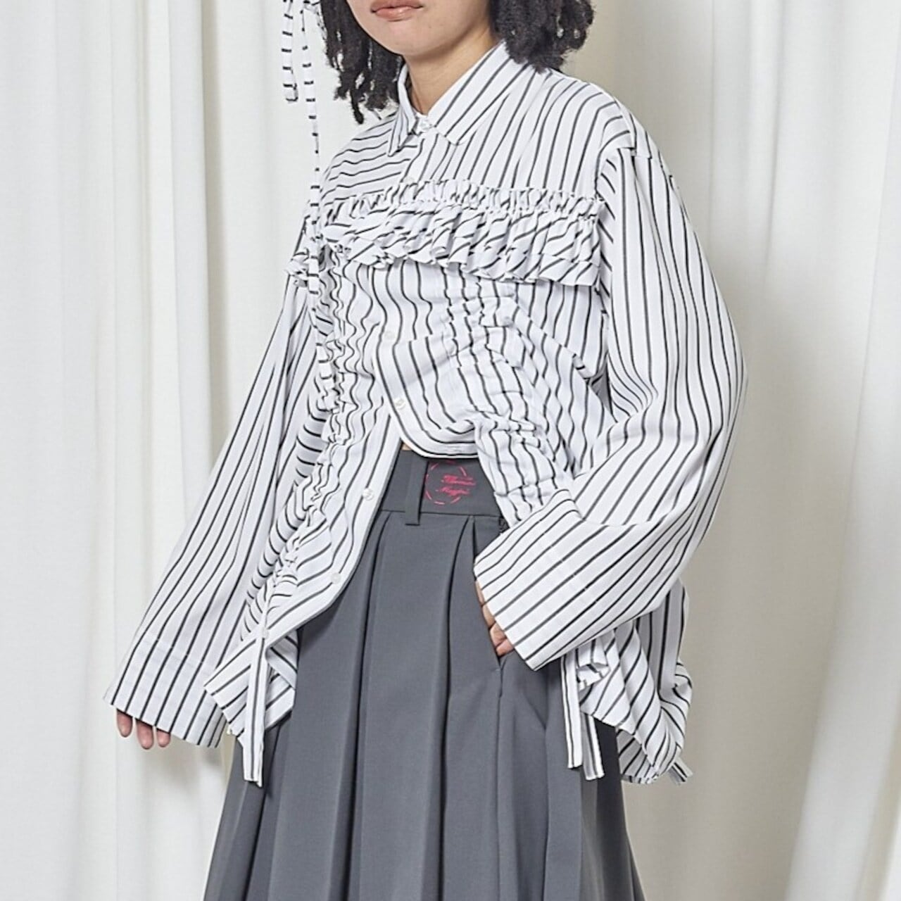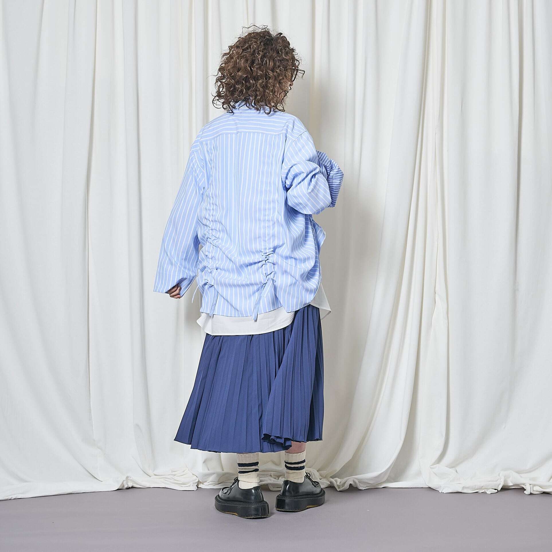 前後にドローストリングリボンを通し、伸ばしたりギャザーを寄せたりと、着方のアレンジが楽しめます。