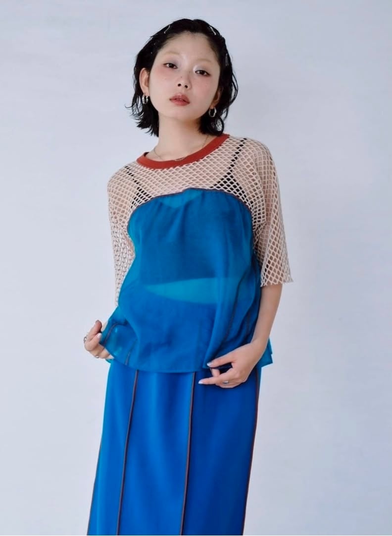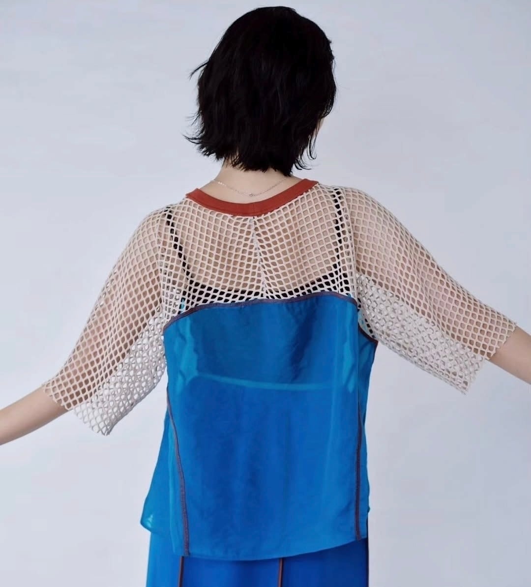 上質で柔らかなストレッチメッシュが、肌に優しくカラーニュアンス効果をもたらしてくれる。春夏の装いが楽しくなるオススメトップスです。