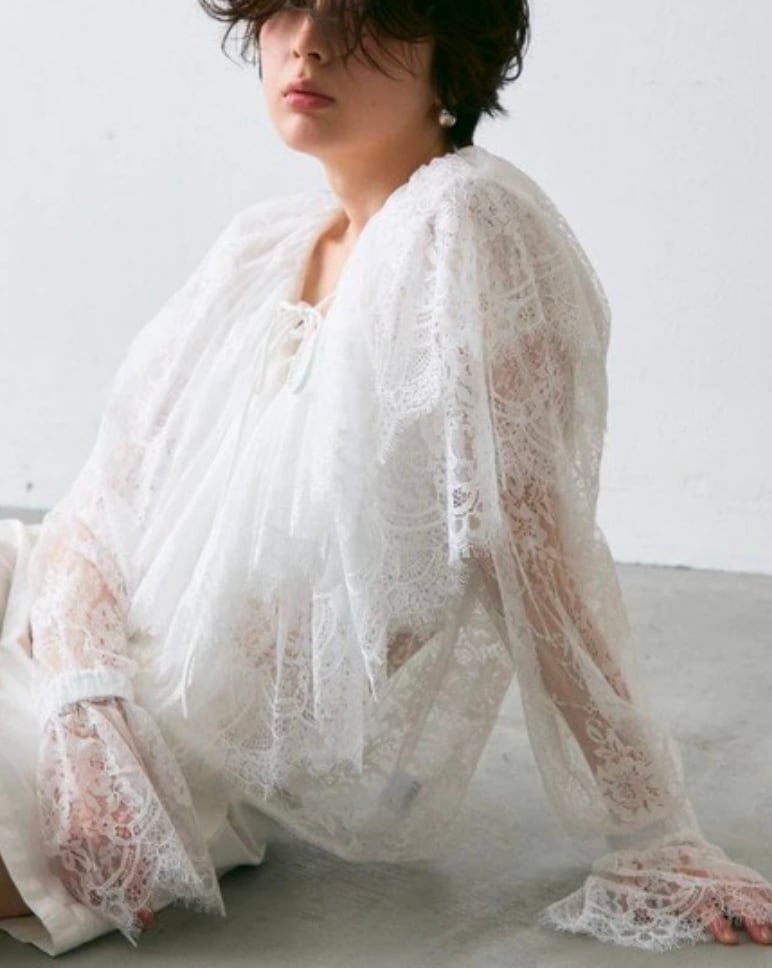 顔まわりを華やかに見せるレースのビッグカラーが主役のブラウス。