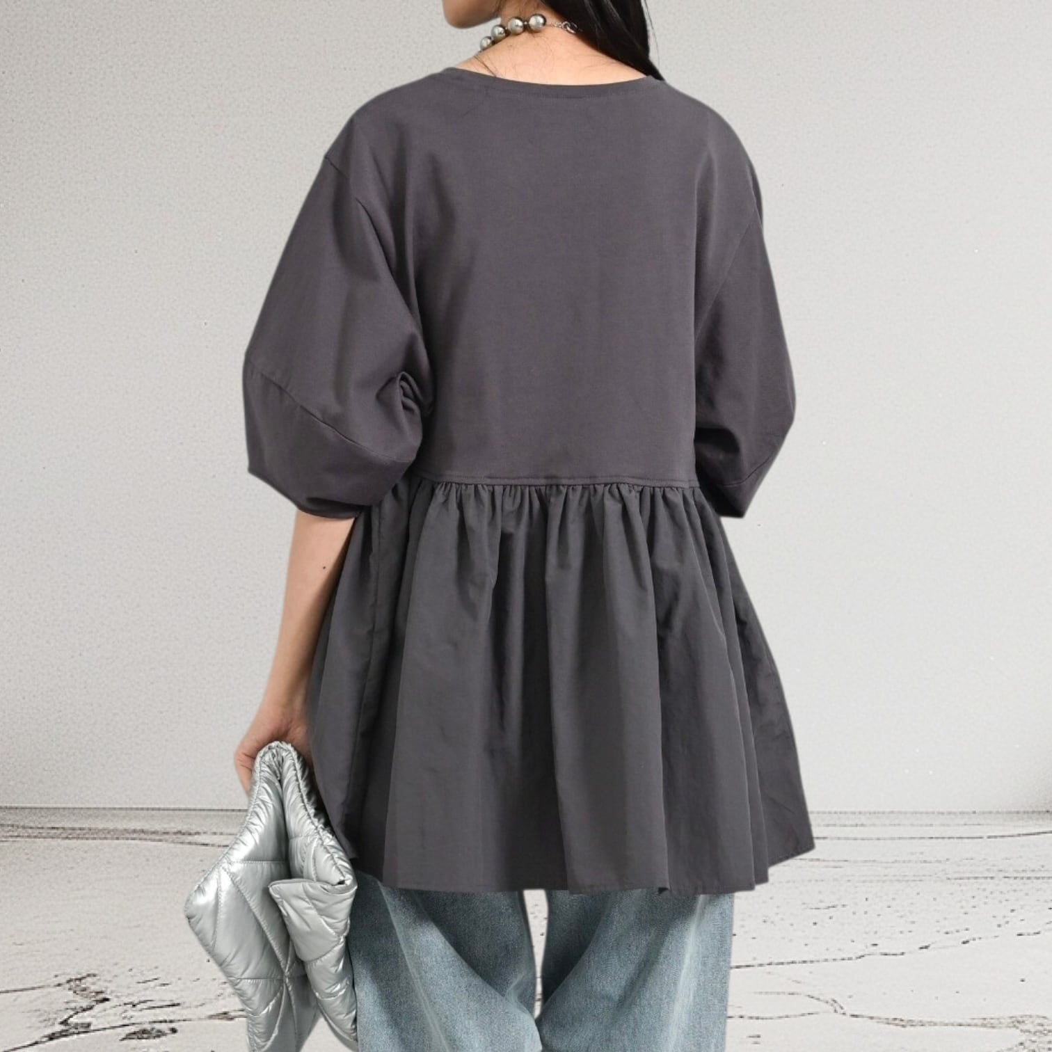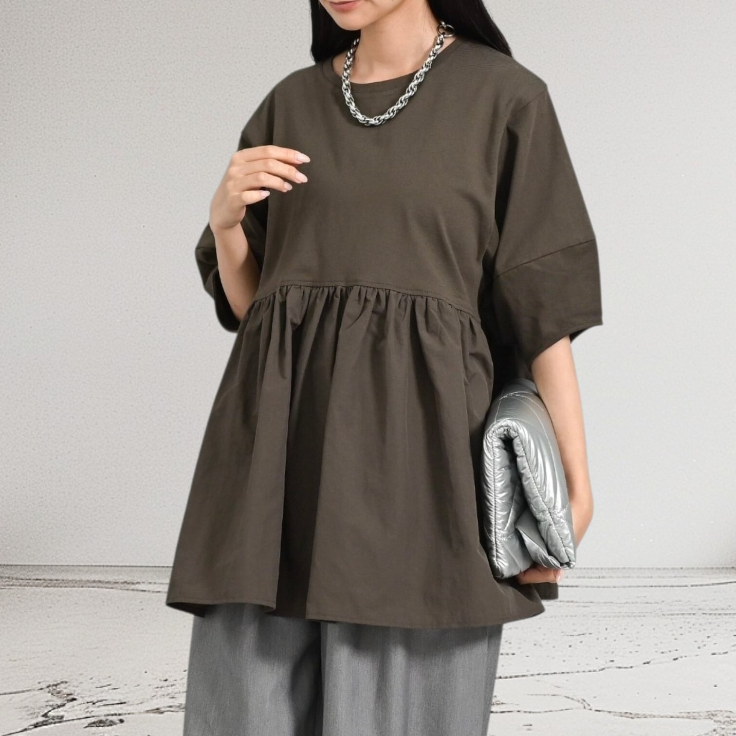 ・ゆったりとしたコクーンスリーブとギャザー切替が、女性らしいシルエットを演出します