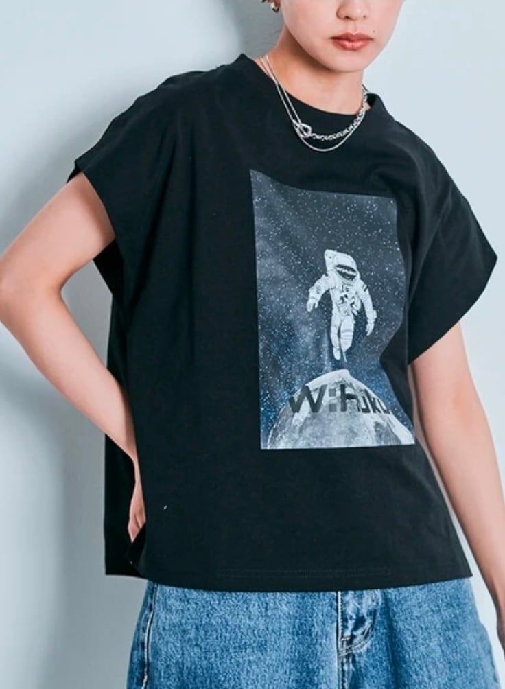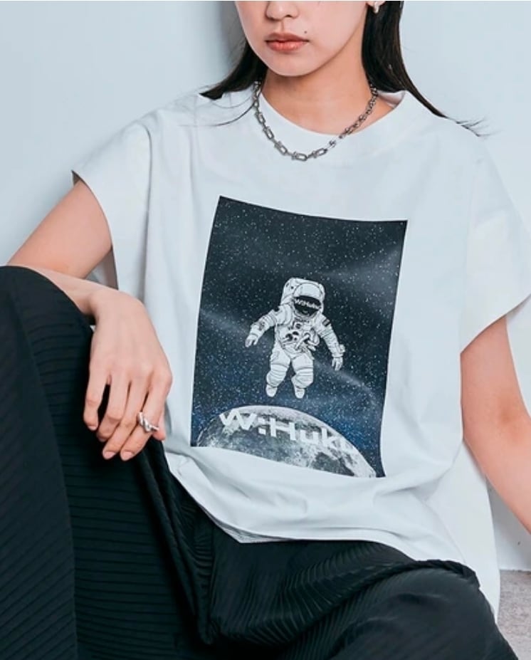 W:HukuのSSテーマであるコスモデザインを採用し、インパクトのあるTシャツに仕上げました。
