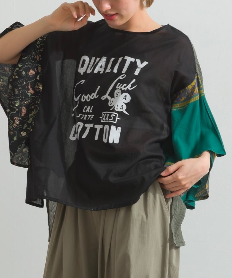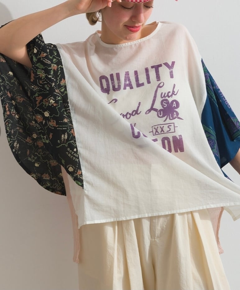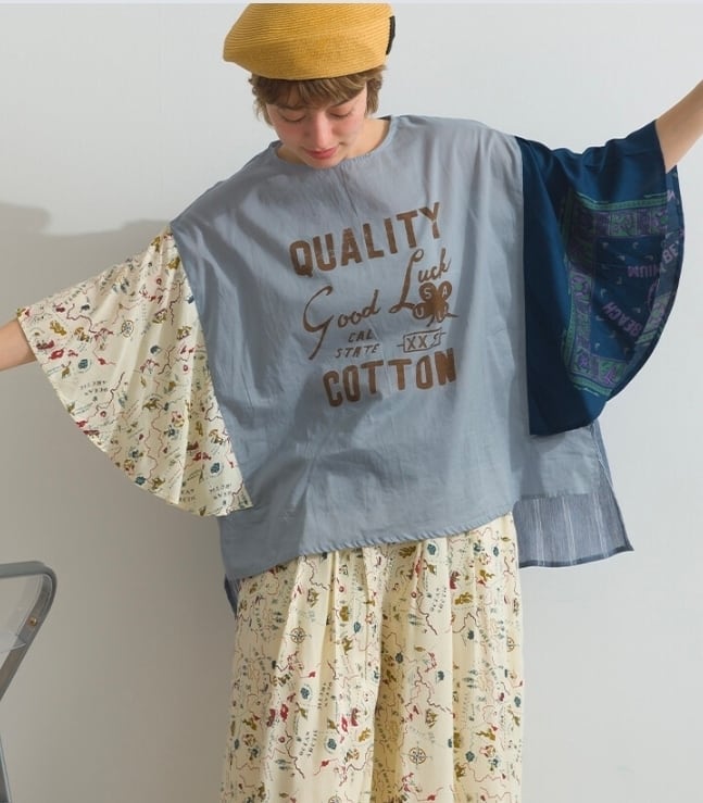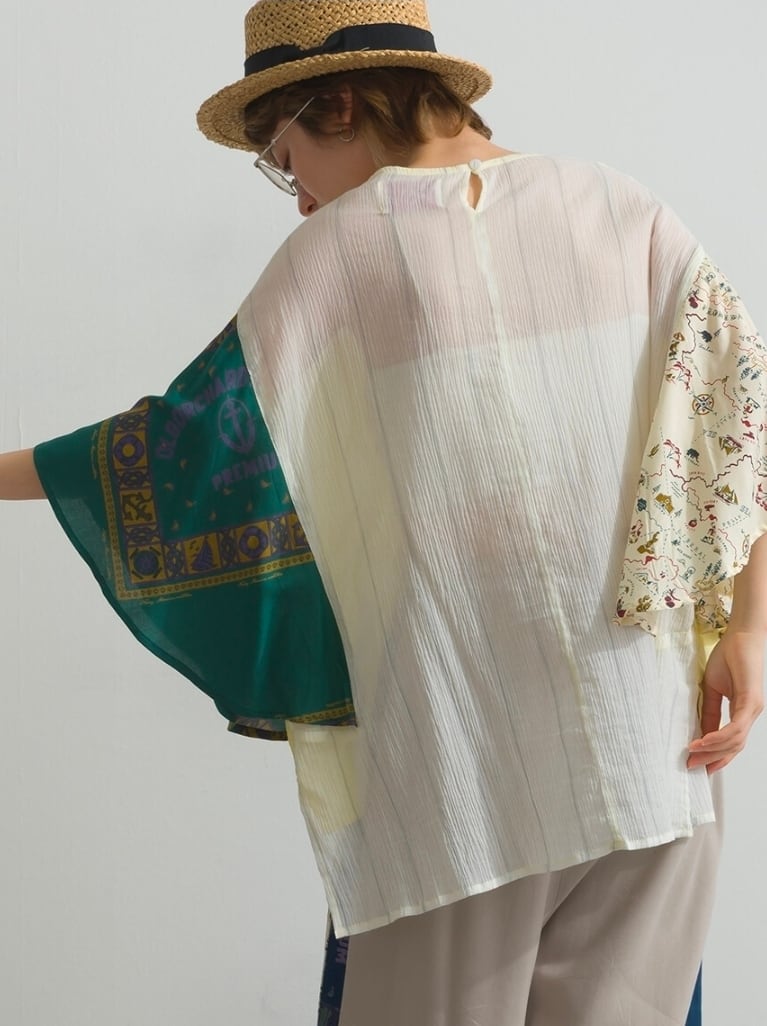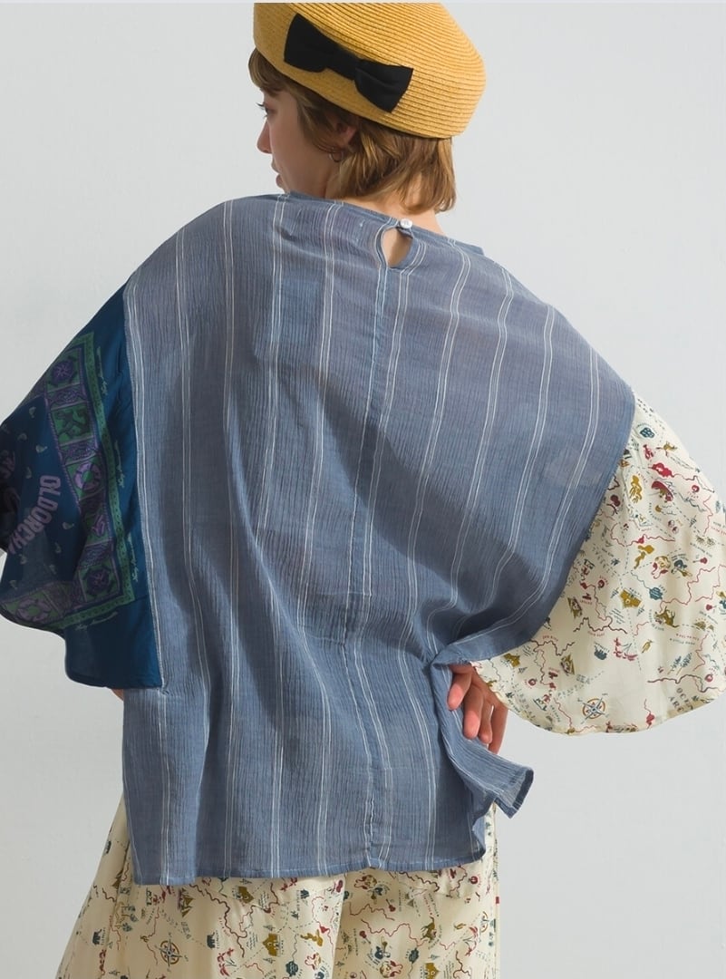 清涼感溢れる綿100%のボイル生地に、あえて不規則なシワを刻んだ「クラッシュボイルストライプ」をベースに使用しています。ストライプの端正な表情と、クラッシュ加工によるラフな質感が組み合わさることで、肌に張り付かないさらりとしたドライな肌触りと、風を孕むような軽やかさを実現しました。そこに、滑らかな落ち感を持つレーヨン100%の地図柄&バンダナ柄プリント生地を大胆にドッキング。綿ボイルのマットな質感と、レーヨン特有の微かな光沢と「とろみ」が重なり合うことで、一枚のプルオーバーの中に圧倒的な素材のコントラストと奥行きを生み出しています。製品洗い加工を施すことで、それぞれの素材が絶妙なバランスで馴染み、アンティークのブラウスを現代的にリメイクしたような、唯一無二の風合いを醸し出しています。