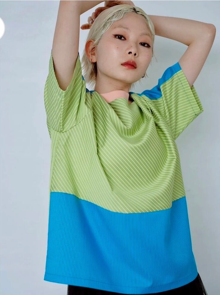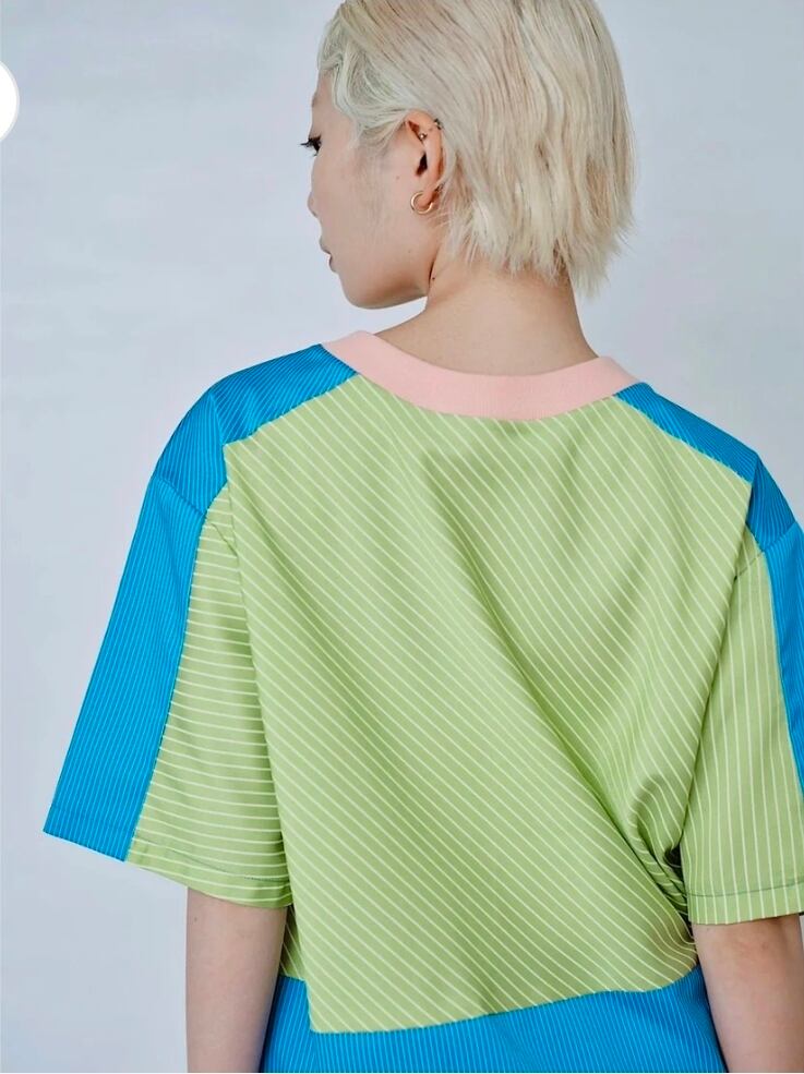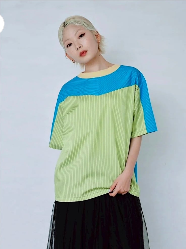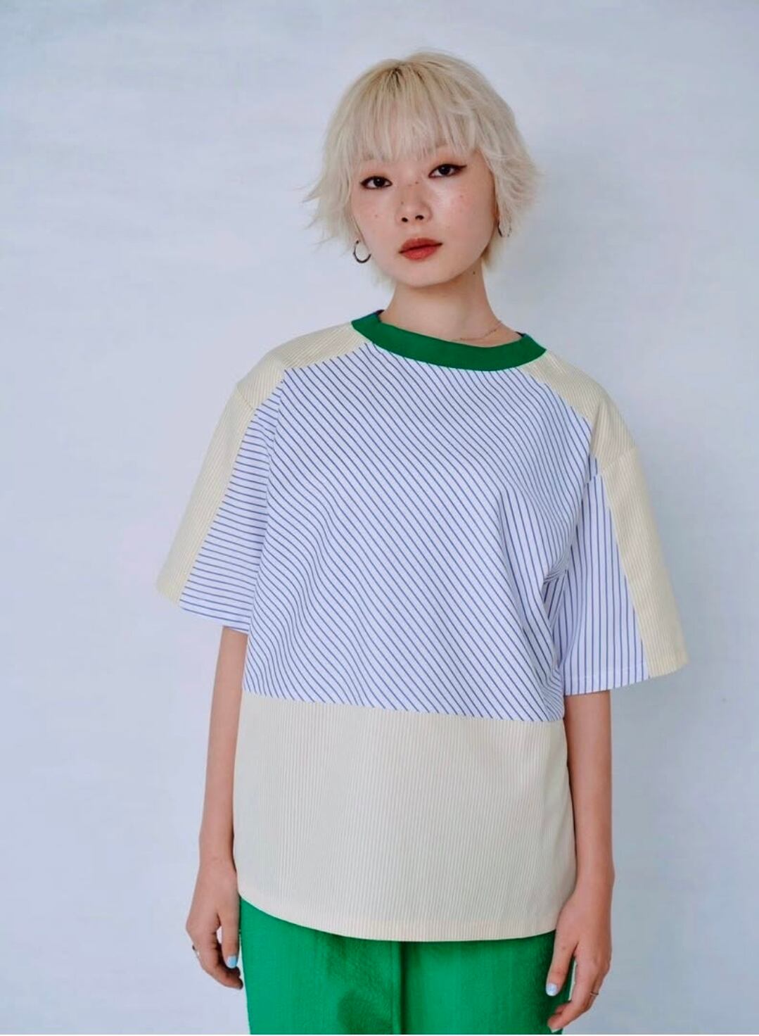 異なるピッチのストライプを組み合わせた切り替えカットソー。