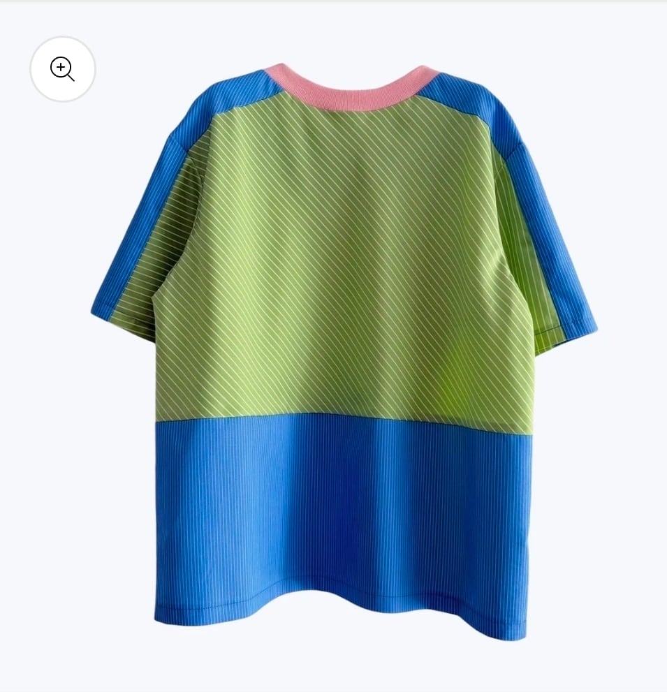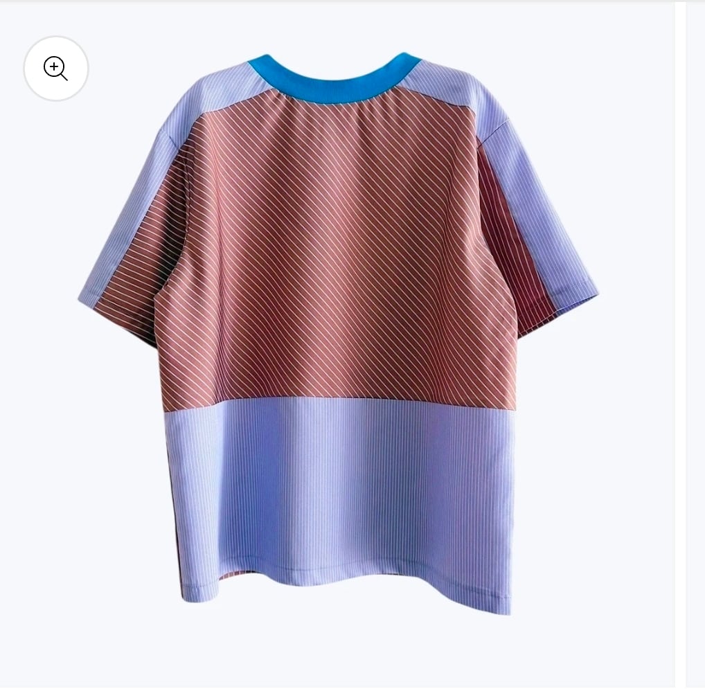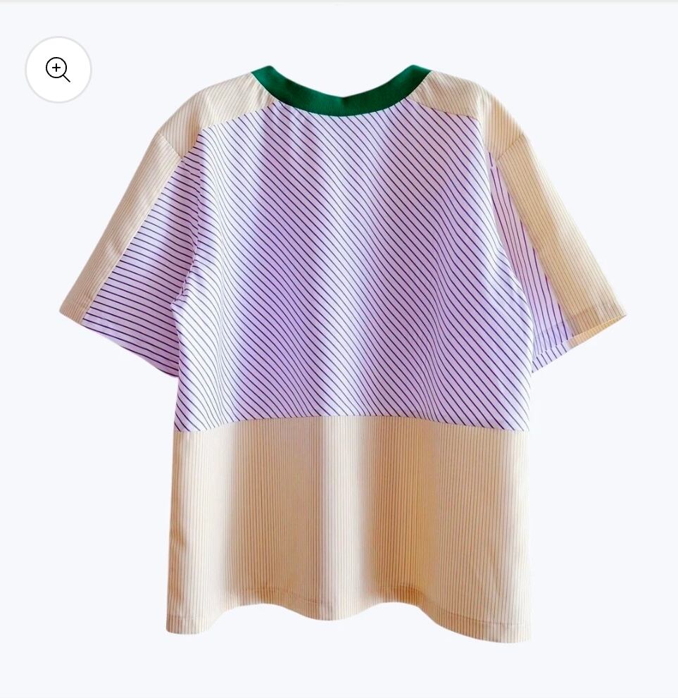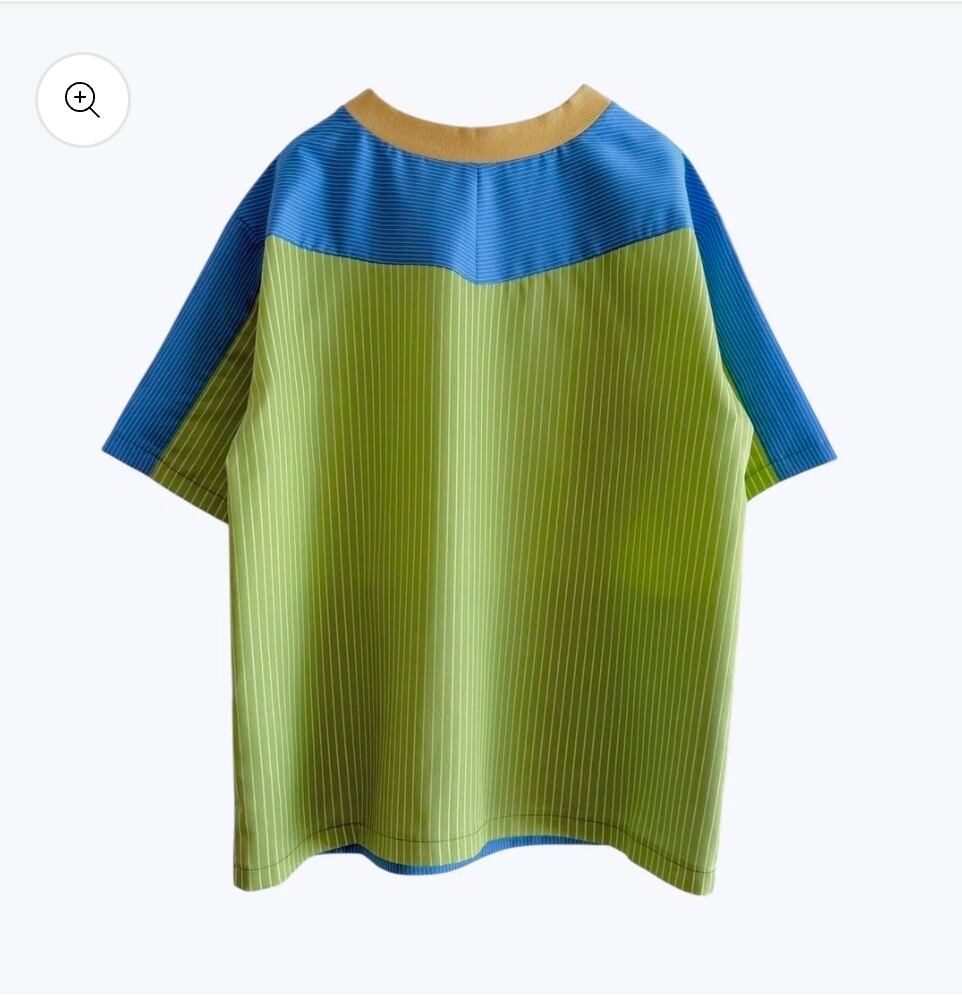 異なるピッチのストライプを組み合わせた切り替えカットソー。